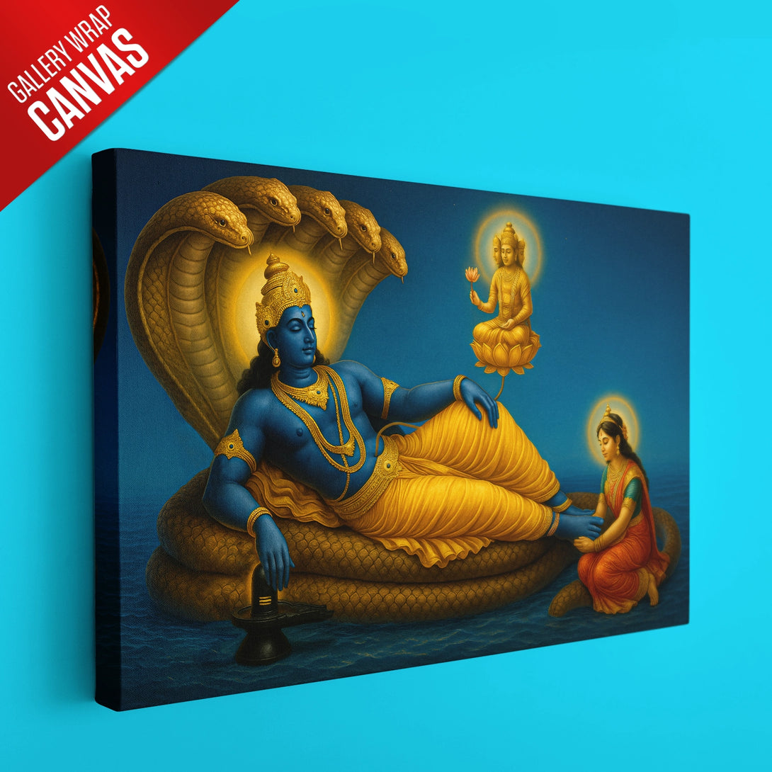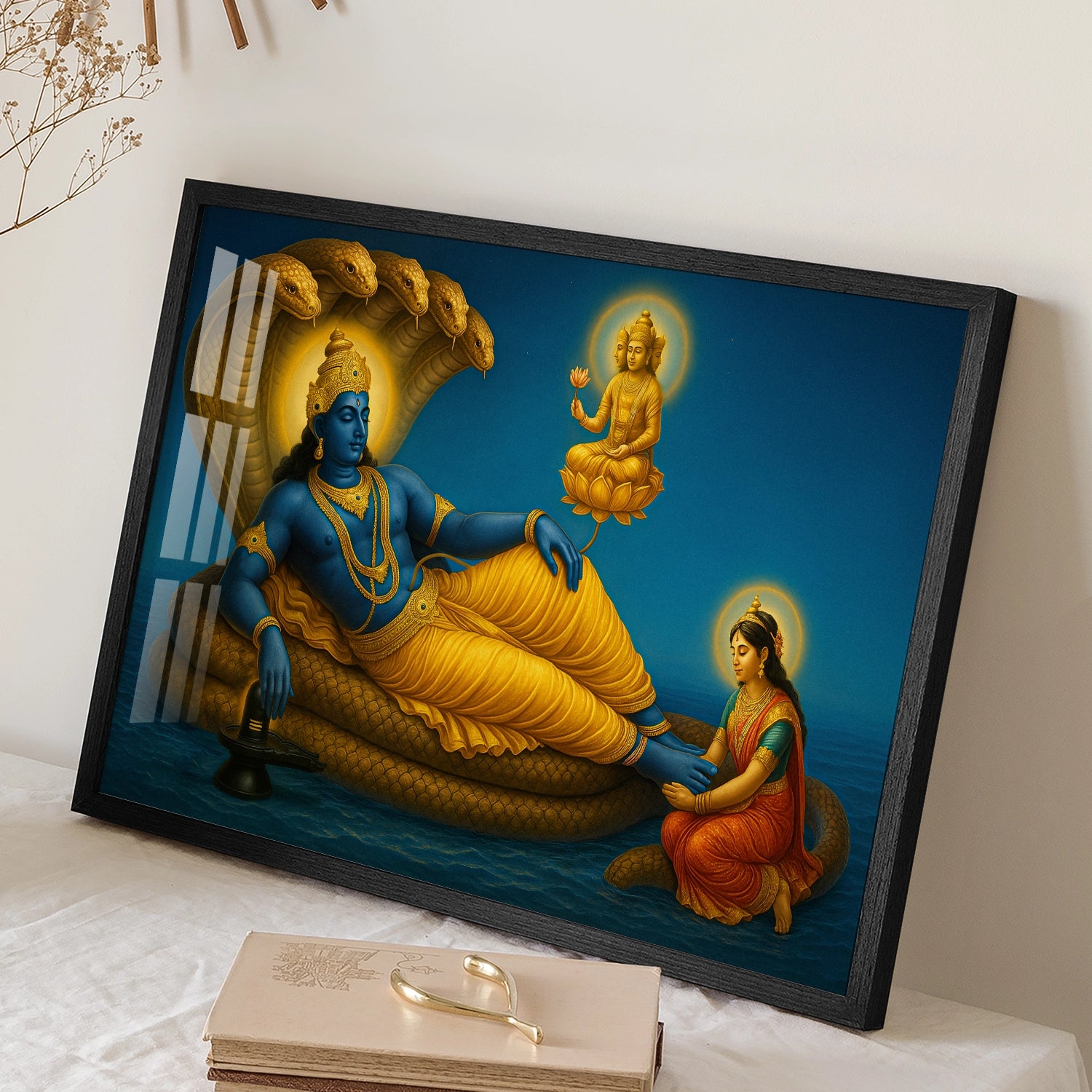 Bring the divine presence of Lord Vishnu and Goddess Lakshmi into your space with our beautifully inspired artwork. This captivating piece tells a story of divine grace, prosperity, and spiritual harmony, making it a must-have for every devotee and art lover. Whether you want to create a peaceful sanctuary in your home or gift a meaningful piece to someone special, this artwork transforms any area into a sacred haven. Crafted with vibrant colors and intricate details, it’s available in premium poster prints, luxurious gallery wrap canvases, and elegant frames—black, white, or dark brown—to perfectly complement your decor.