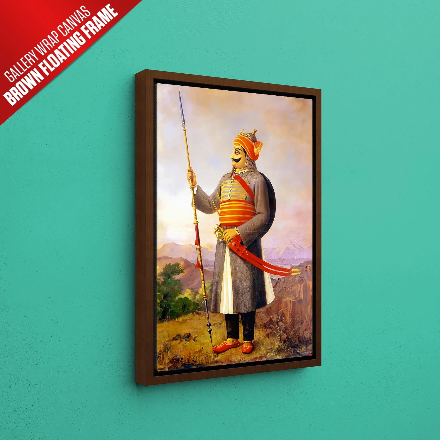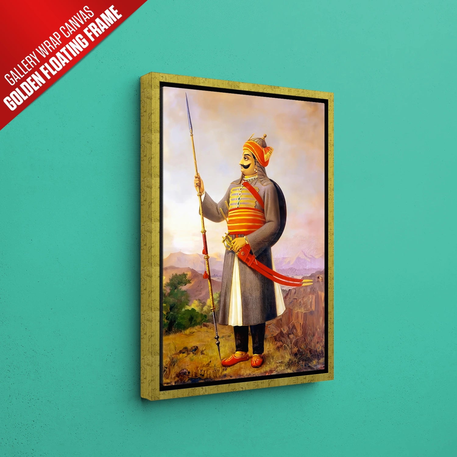 Enhance your space with this exquisite portrait of Maharana Pratap, the iconic Rajput warrior king of Mewar. This artwork captures the regal presence and indomitable spirit of Maharana Pratap, adorned in his traditional armor and royal attire.