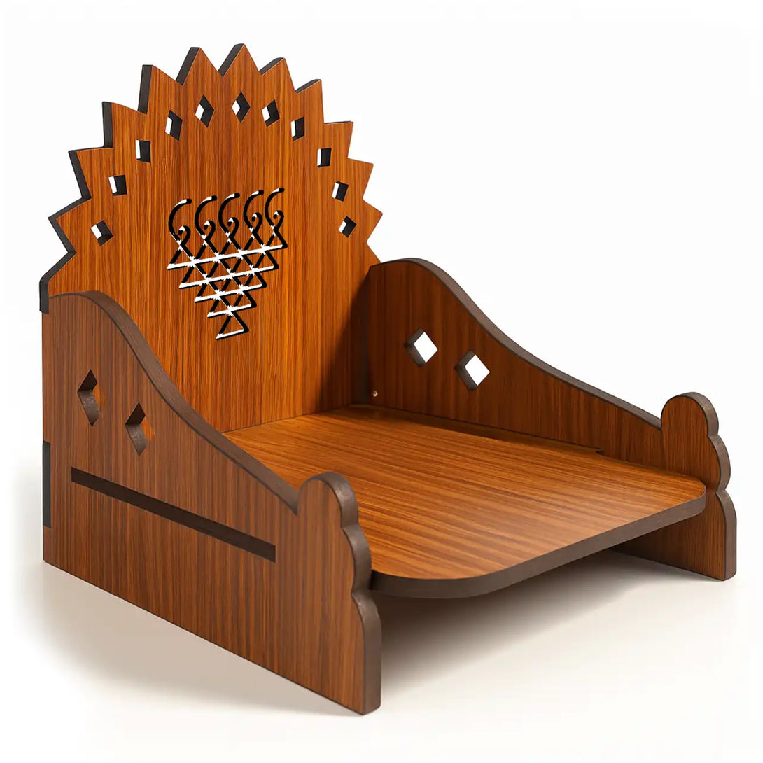This expertly crafted Wooden MDF Singhasan in a warm brown finish serves as a sturdy and elegant platform for your temple or pooja setup. It features a detailed Sarasvati Yantra Mandala backdrop, enhancing the spiritual ambiance and providing a sacred focus point during worship. Combining durability with traditional design, this chowki supports your devotional practices with both function and reverence, perfect for daily rituals and special ceremonies.