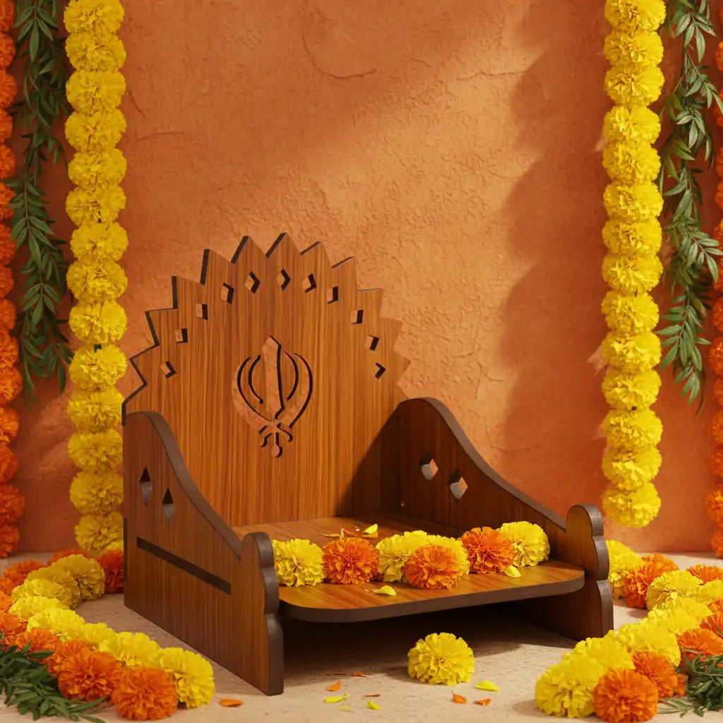 Wooden MDF Brown Singhasan/Temple/Pooja Chowki with Sikhism Khanda Symbol Mandala Backdrop