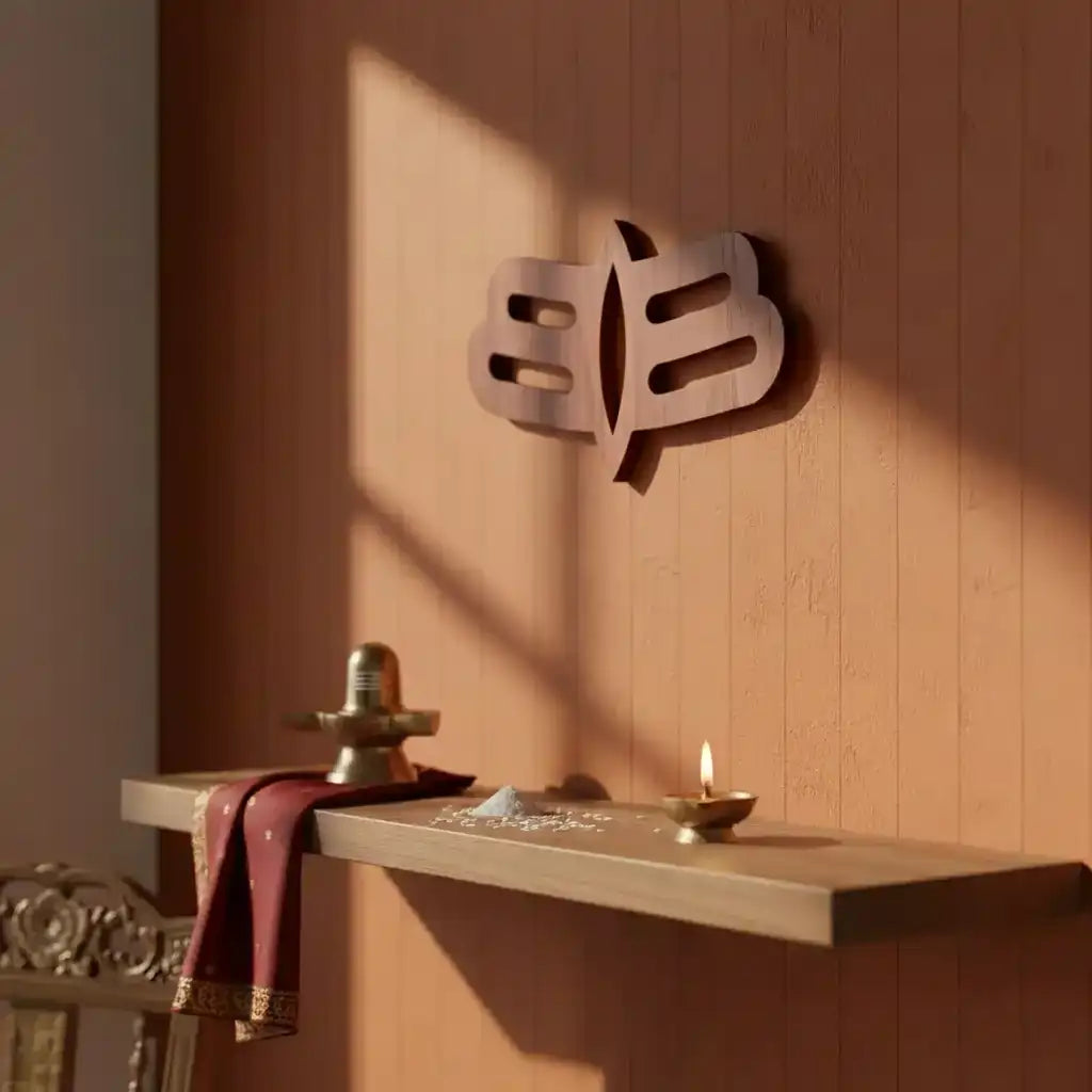 Transform your sacred space with this meticulously carved wooden Tripundra wall art, embodying the revered Shiva Tilak tradition. Each piece showcases the three sacred horizontal lines—a powerful symbol of spiritual awakening and divine protection in Hindu philosophy. Crafted from premium wood with precision cutout detailing, this Mahakal-inspired artwork serves as both a devotional focal point and sophisticated décor element. Select from three distinct dimensions—6, 12, or 18 inches in width—to suit your temple altar, meditation corner, or home sanctuary. The natural wood aesthetic seamlessly integrates with traditional and modern interiors alike, while maintaining the profound spiritual significance of this auspicious symbol. An exceptional choice for practitioners seeking authentic religious art that honors their faith with elegance and reverence.