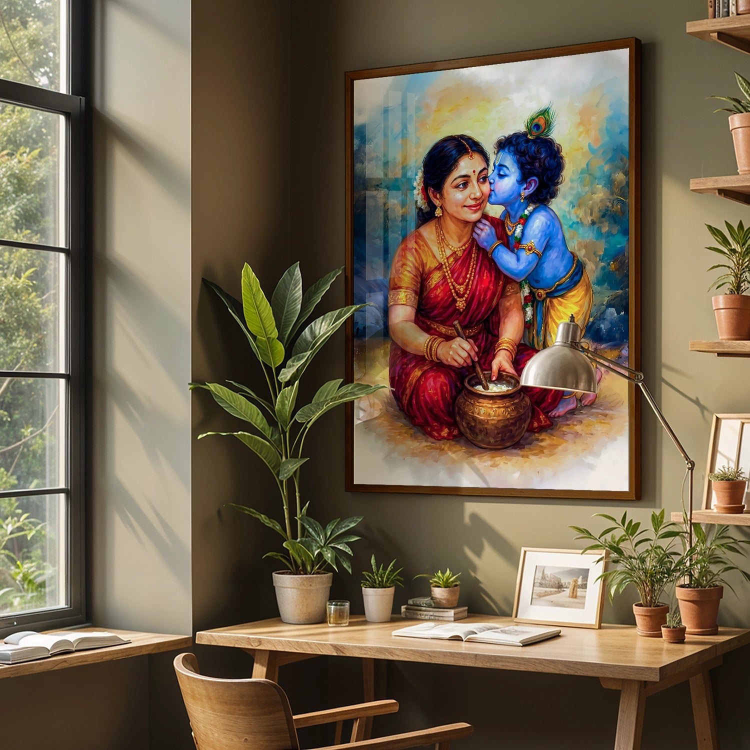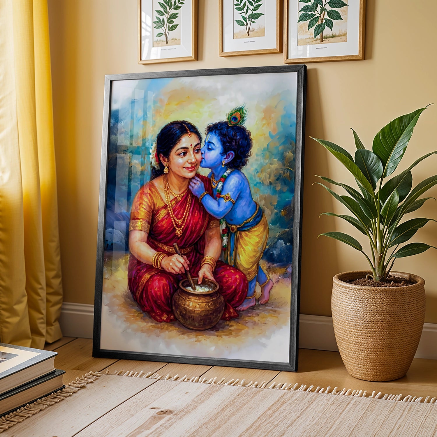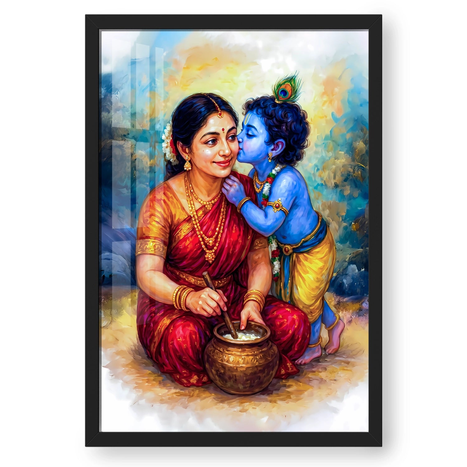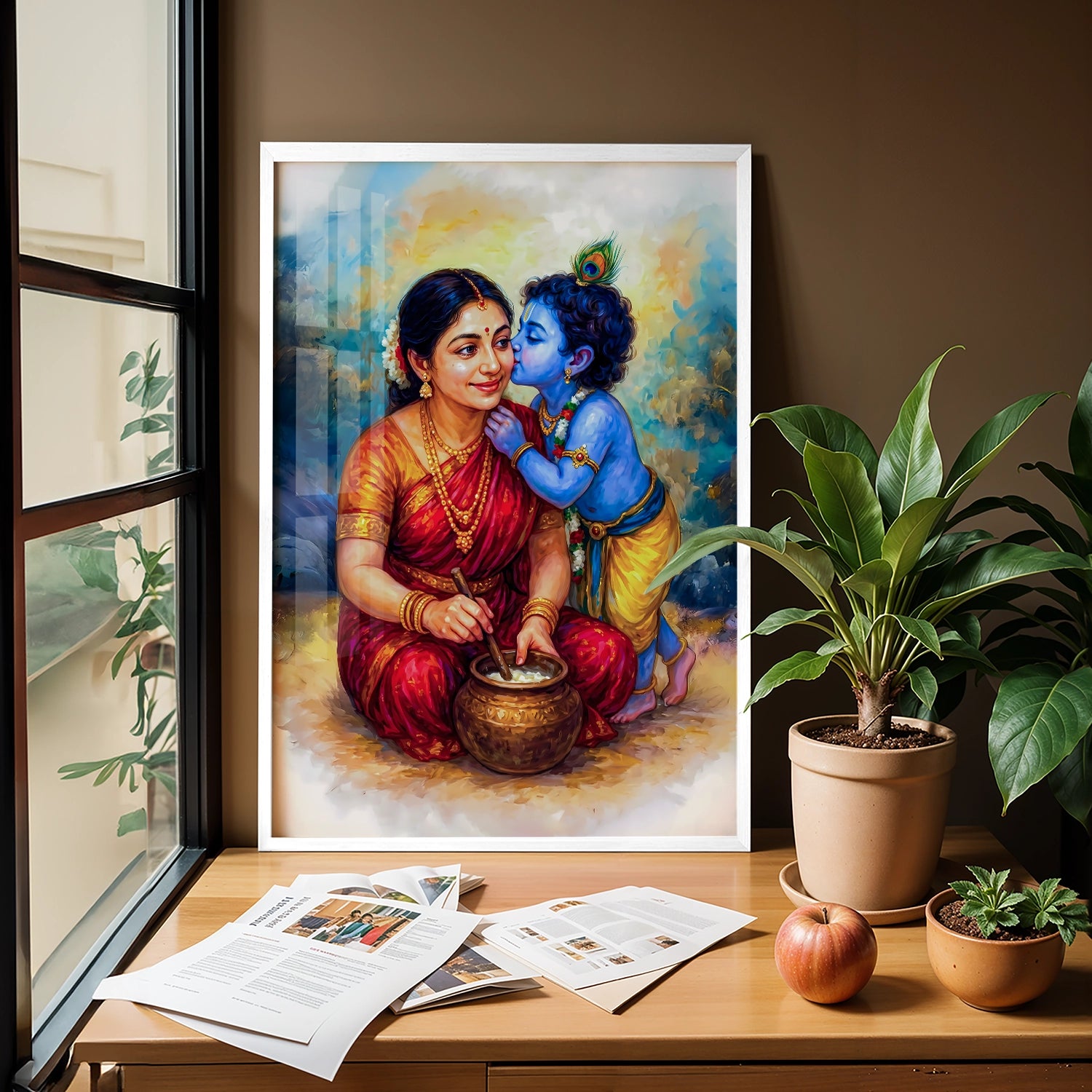 Bring home the purest form of love and devotion with this exquisite Yashoda Maiya & Bal Krishna devotional artwork. This painting captures a timeless moment where divine innocence meets unconditional motherhood—Krishna’s gentle kiss on Yashoda’s cheek symbolizes protection, warmth, and eternal bonding. Every brushstroke radiates peace, making this artwork not just décor, but a spiritual presence in your space.