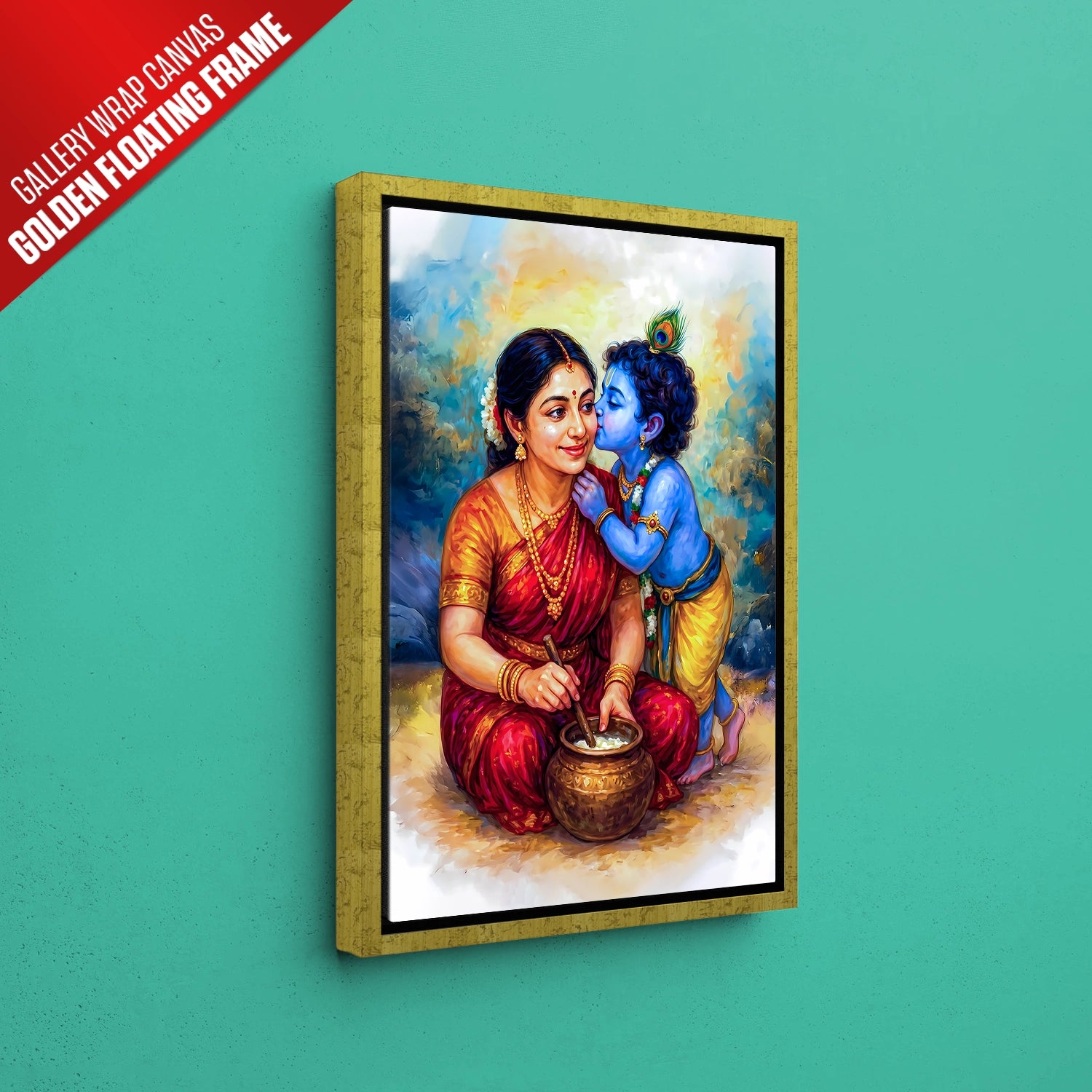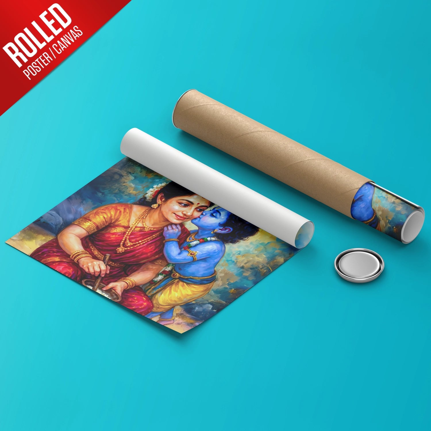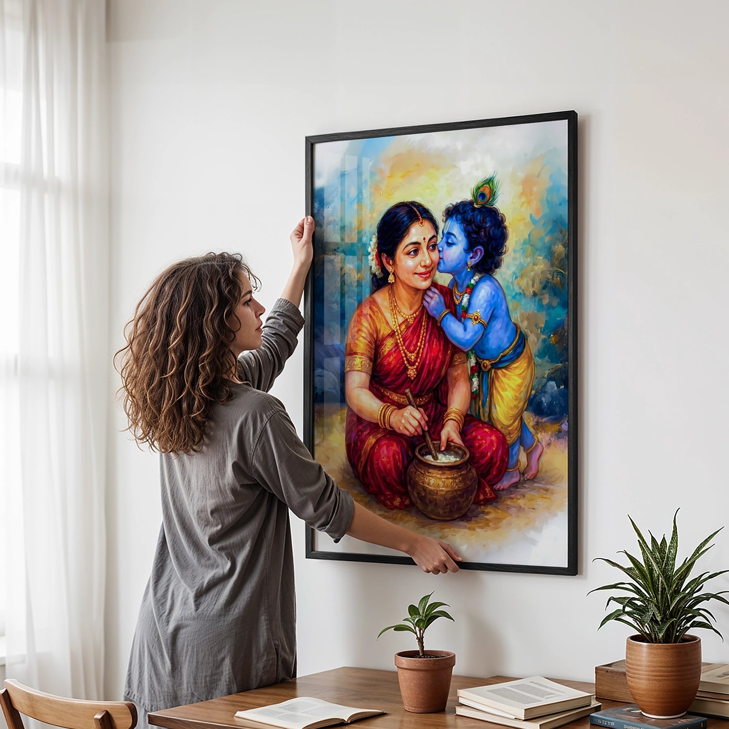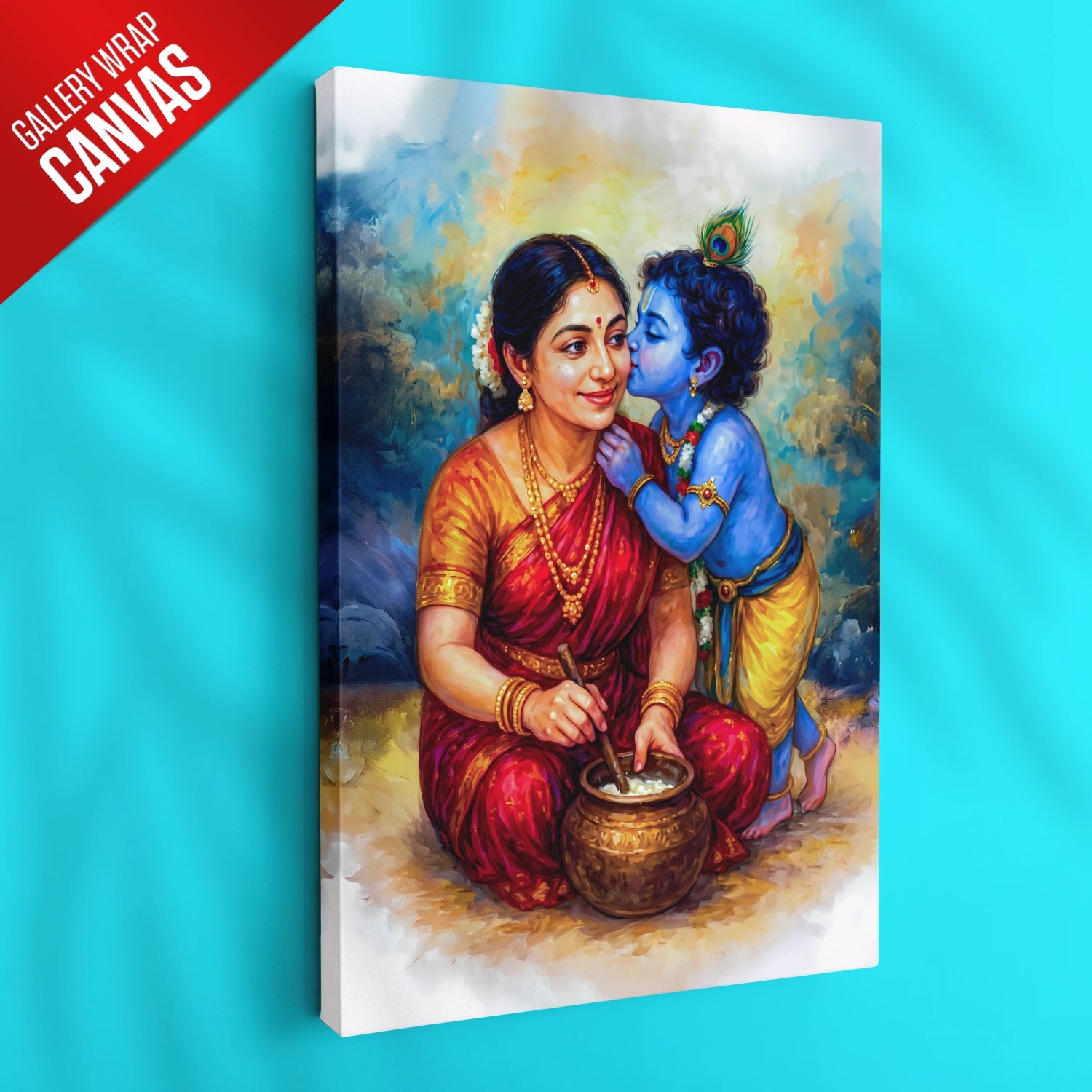 Bring home the purest form of love and devotion with this exquisite Yashoda Maiya & Bal Krishna devotional artwork. This painting captures a timeless moment where divine innocence meets unconditional motherhood—Krishna’s gentle kiss on Yashoda’s cheek symbolizes protection, warmth, and eternal bonding. Every brushstroke radiates peace, making this artwork not just décor, but a spiritual presence in your space.